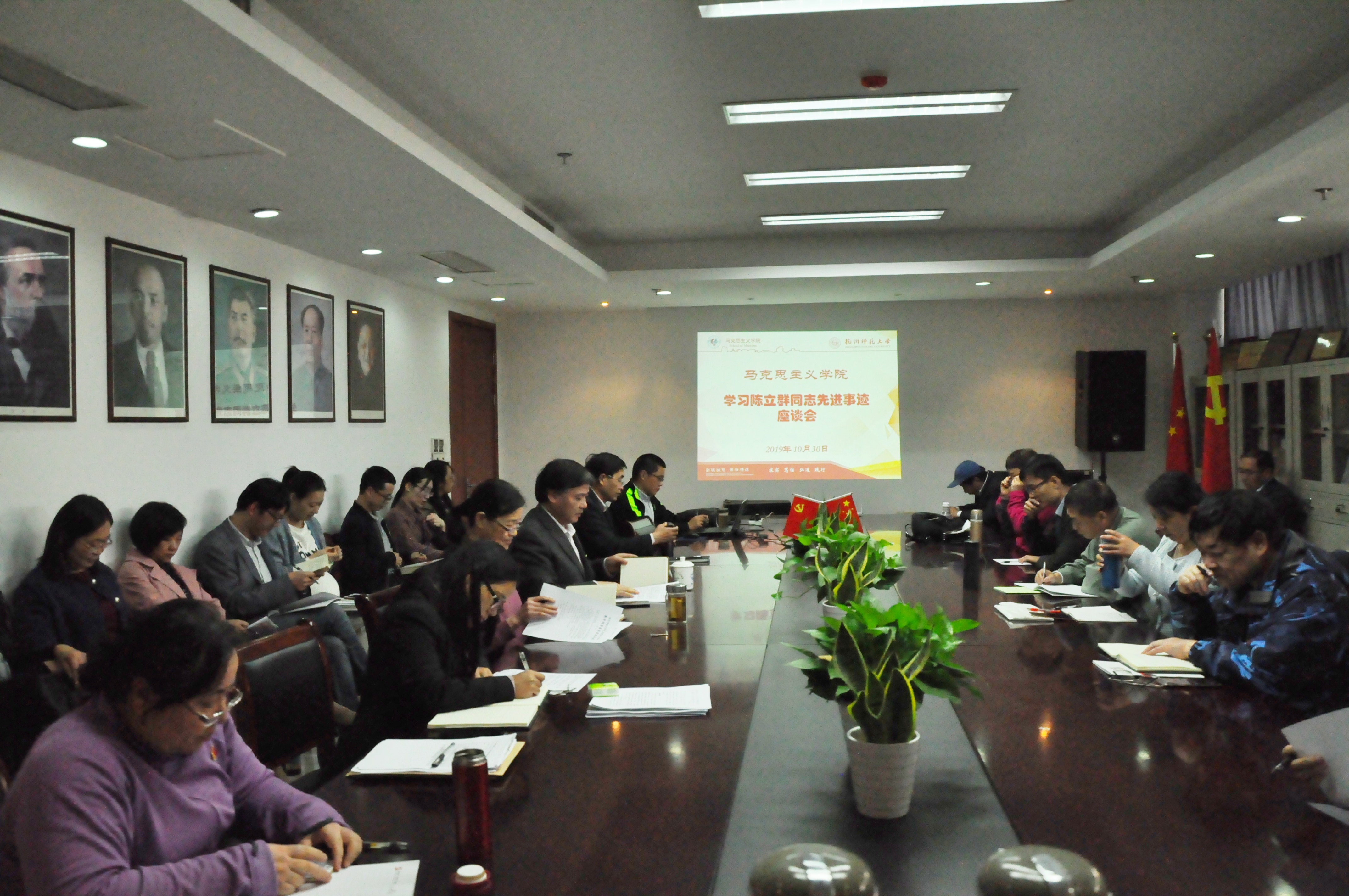 10月30日下午,在恕园1号楼306会议室,亚洲无码 党总支组织召开全体教职工学习陈立群同志先进事迹座谈会。学院党总支书记、院长余龙进主持并讲话,副院长何丽君和全体教职工参加,研究生党支部书记方勇骏博士作主旨发言。