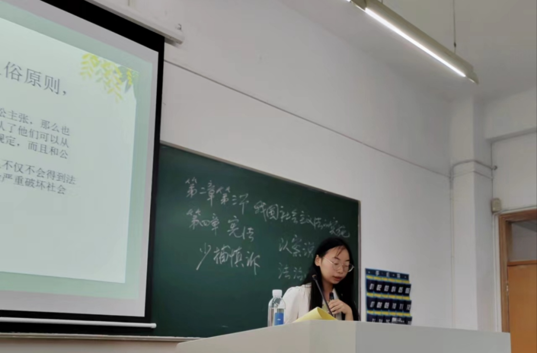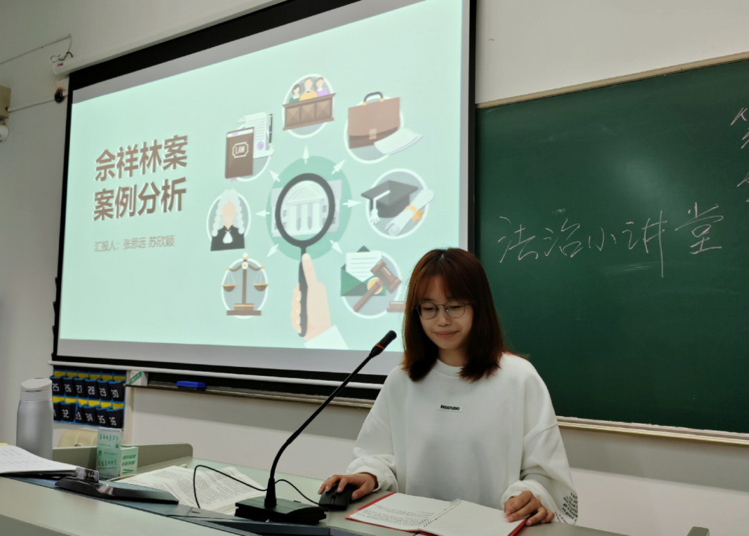 “法院依法判处肖开俊等三人有期徒刑十三年,并处罚金;责令退赔经济损失。”这是孙宇泽、许琰杰同学在法学概论课上通过“以案说法”的方式分享的非法集资犯罪案例的判处结果。“法治小讲堂——以案说法活动”是李洪波教授精心策划的活动。在每周的法学概论课上,两组同学分别分享一个法治案例,从案件的起因经过结果,讲到审判时所运用到的法学理论,以加深马院思想政治教育本科生们对法律的认识和对法学理论的理解。不仅如此,我们还将通过民法典小视频、环球法律辩论、模拟法庭等多种多样的活动,潜移默化地培养同学们的法学素养,增加法律知识。
