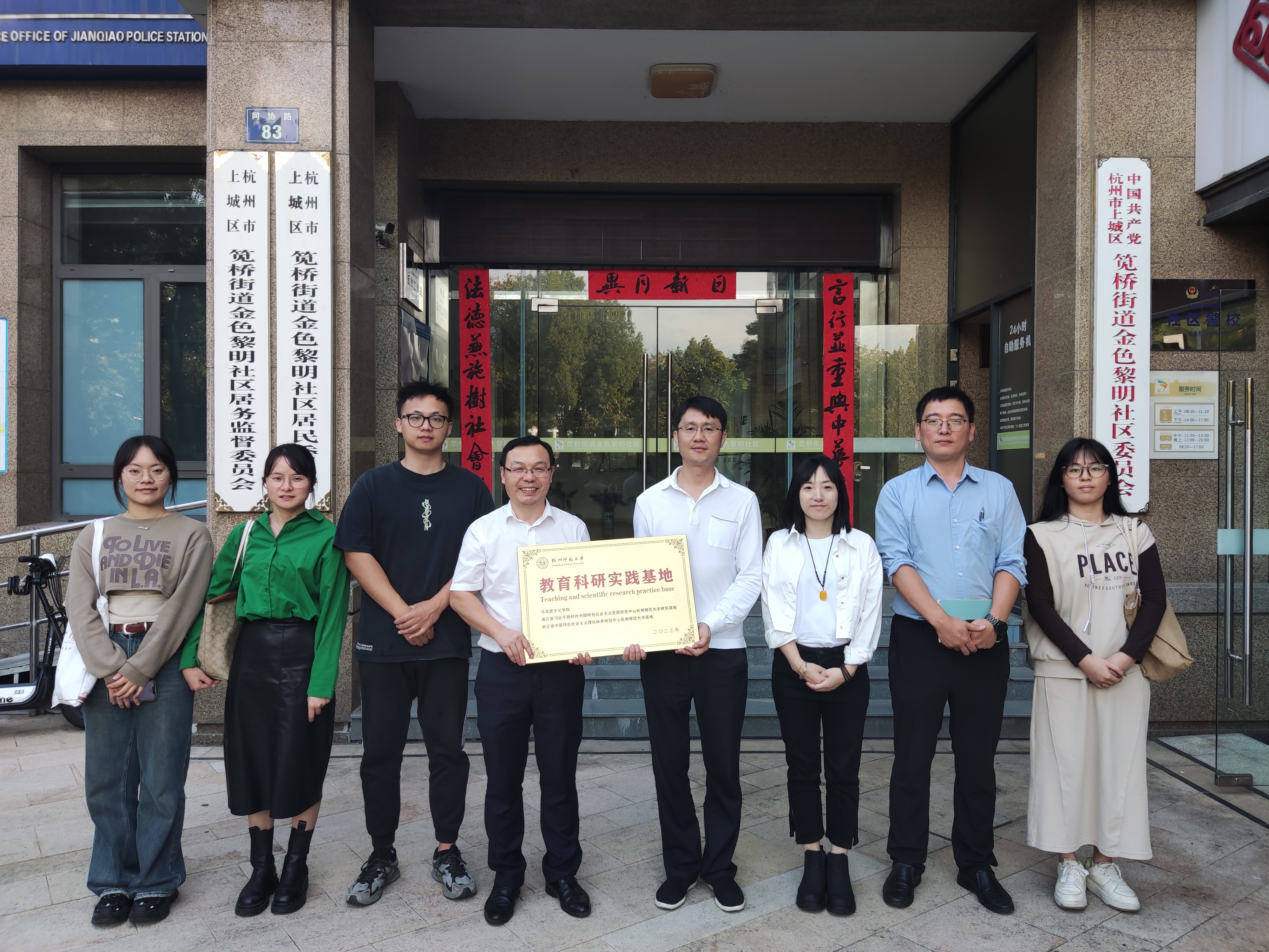 此次仪式的顺利举行为双方后续活动的深入开展打下了良好基础,相信日后实践活动的推进将会不断创新书写校地合作的新篇章。在签约授牌交流结束后,双方于金色黎明社区居民委员会前合影留念。