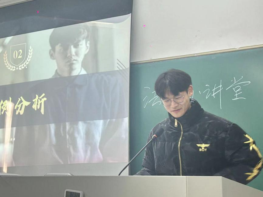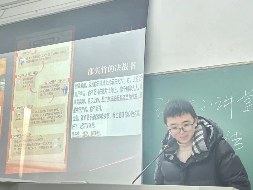 第二组:思政231班的徐焕易、思政232班的许叶城、思政222班的周伟盛同学,分享了吴某某强奸、聚众淫乱、偷税漏税案。吴某某多次趁女性不知反抗或不能反抗之机,强行与之发生性关系、组织淫乱活动并偷税漏税,造成了十分恶劣的社会影响。