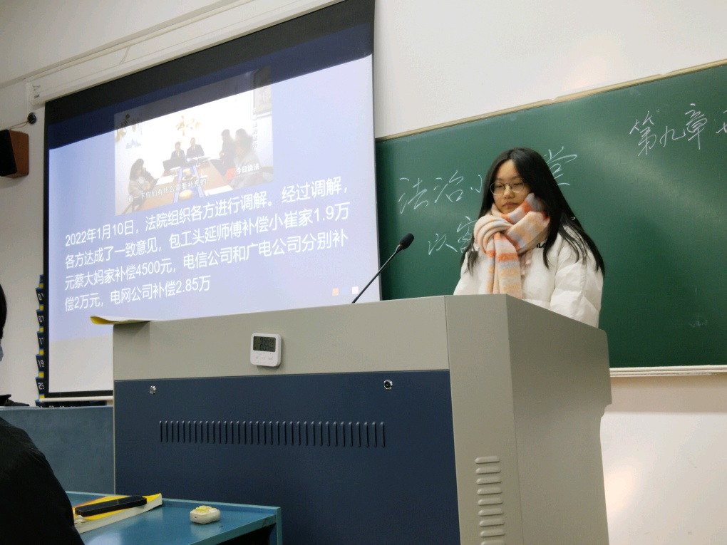 第三组:思政233班的许壹然、潘文烨、周晔座同学,带来案件:小崔一家的牛被电死,一开始三方行为人蔡大妈,包工头,三家公司都相互推卸责任。牛死的事实给小崔一家造成巨大的经济损失,于是他们寻求司法帮助。法官为了让小崔一家尽快得到补偿,寻找三方调解,最后三方达成一致共识,小崔一家得到应有的赔偿。这个案例充分体现了调解这一解决纠纷的方式的优越性。同时也让我们感受到邻里互助的温暖。