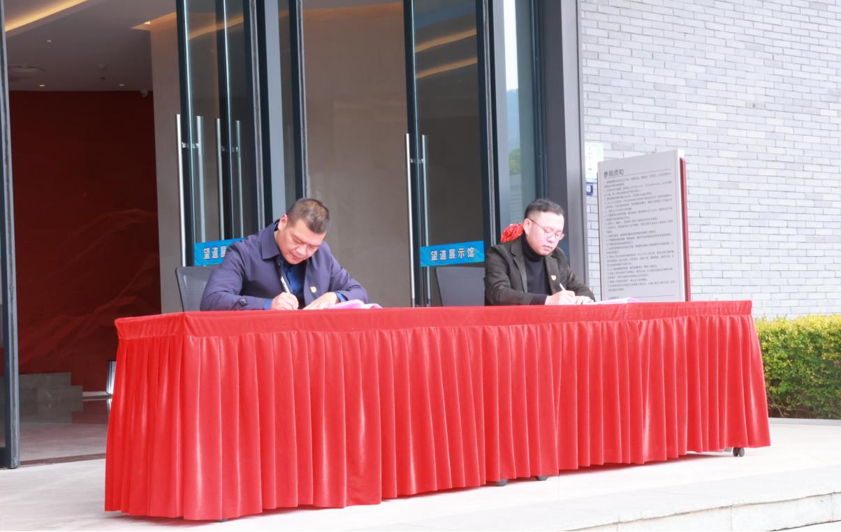 在参观望道展示馆前,亚洲无码 与分水塘村举行了隆重的实践基地签约挂牌仪式,亚洲无码 党委书记、院长李洪波,党委委员、副院长龚上华,与义乌市分水塘村党支部书记张跃林、义乌市分水塘村青年委员陈卫强进行现场签约和双基地(“教育科研实践基地”“大中小思政教育一体化基地”)揭牌仪式。