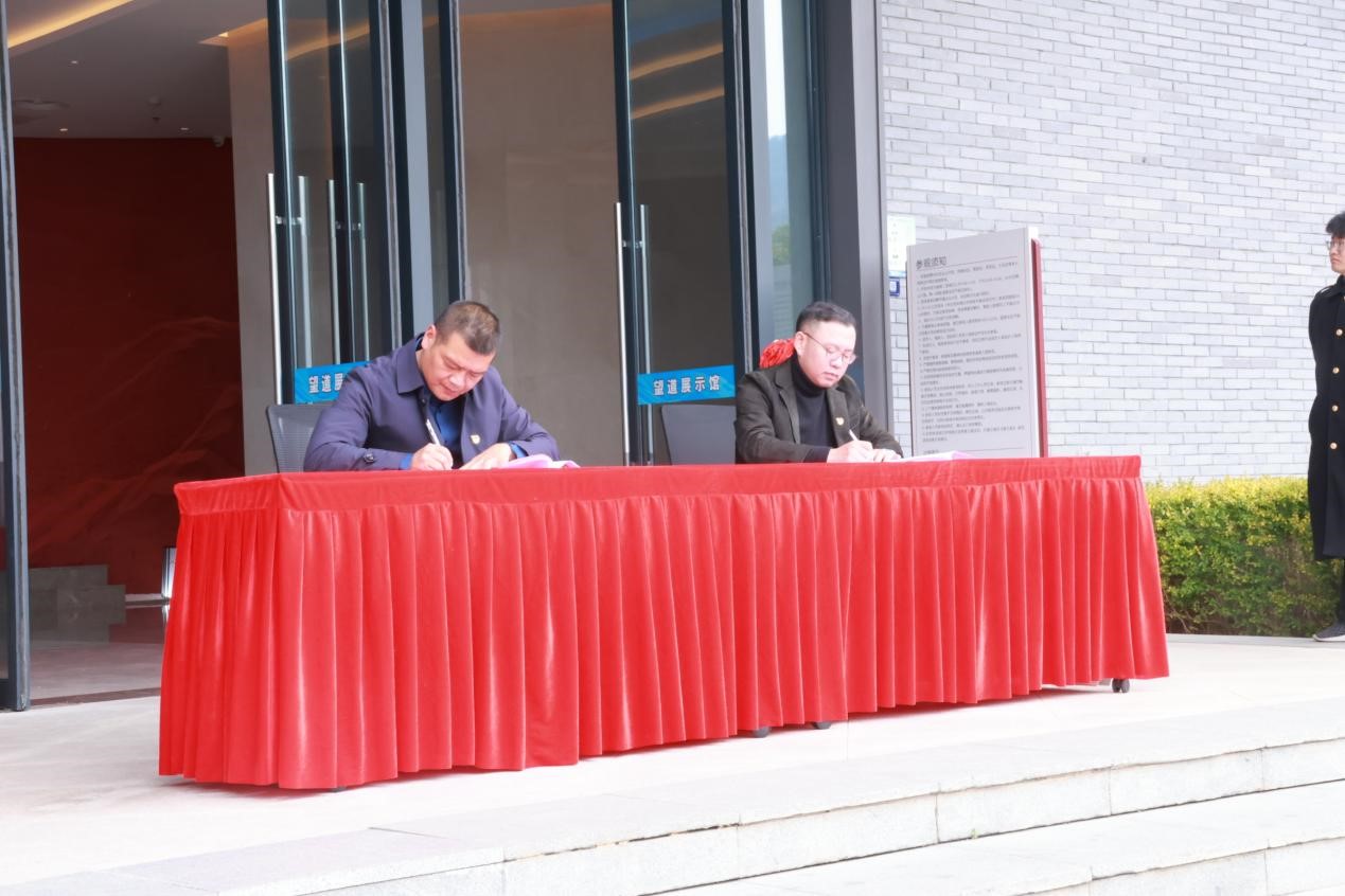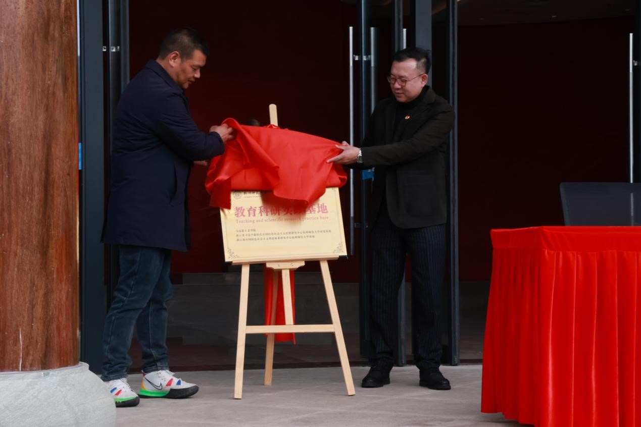 在参观望道展示馆前,马克主义学院与分水塘村举行了隆重的实践基地签约挂牌仪式,亚洲无码 党委书记、院长李洪波,党委委员、副院长龚上华,与义乌市分水塘村党支部书记张跃林、义乌市分水塘村青年委员陈卫强进行现场签约和双基地(“教育科研实践基地”、“大中小思政教育一体化基地”)揭牌仪式。