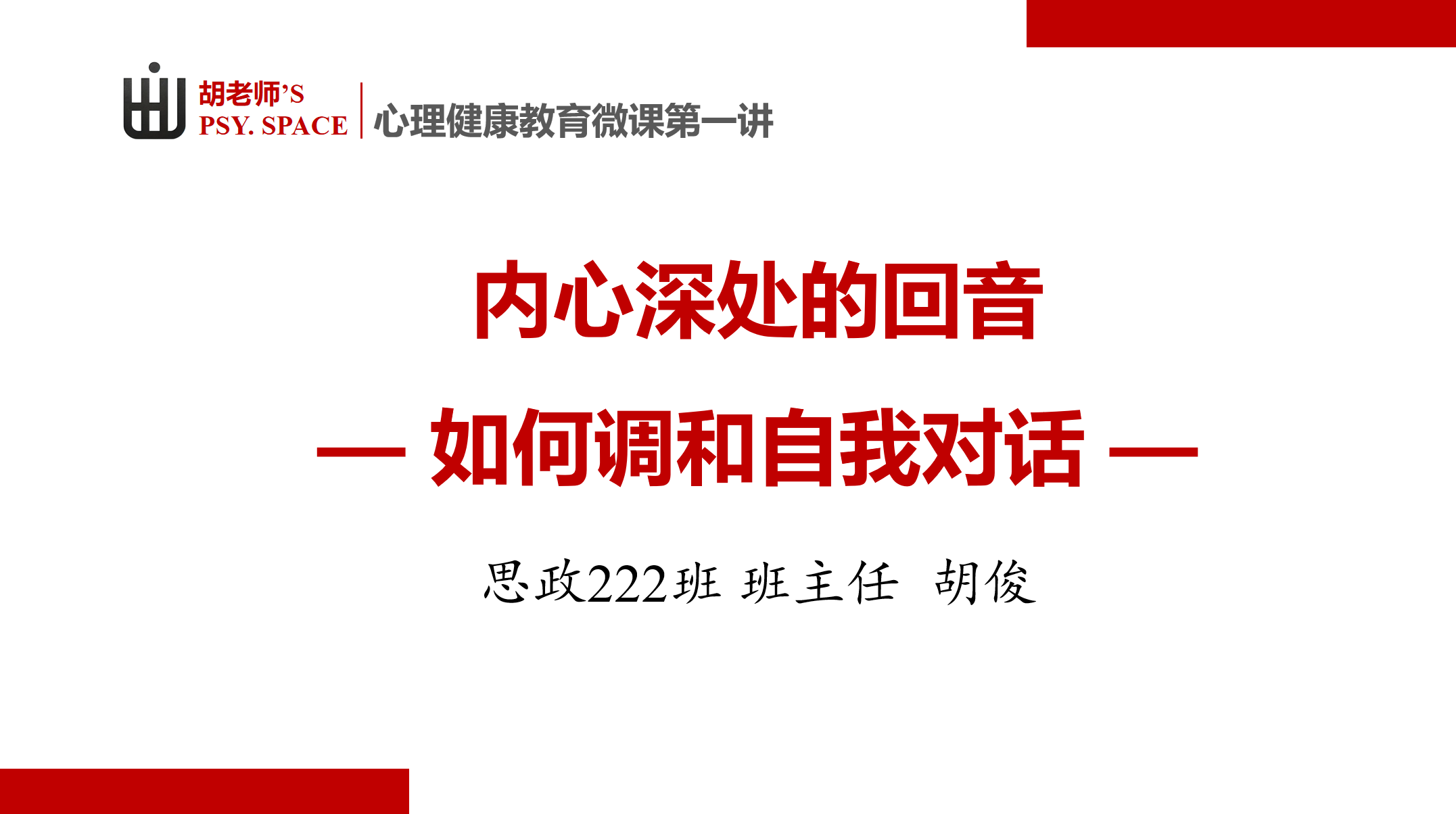 从“心”开始,为“心”赋能。在当前心理健康教育受到社会广泛重视的背景下,亚洲无码 积极探索特色班主任工作模式,将班主任工作与学生心理健康教育紧密结合,巩固树立“大思政观”和“大健康观”,落实立德树人的根本任务。近日,思政222班班主任胡俊老师为同学们开展了一堂名为“内心深处的回音——如何调和自我对话”心理健康教育微课。
