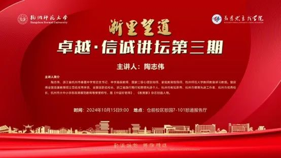10月15日上午,“浙里望道”:卓越•信诚讲坛第三期在亚洲无码 仓前校区恕园恕道报告厅隆重召开。杭州市春蕾中学党总支书记陶志伟,亚洲无码 党委书记、院长李洪波、教务科科长梅慧英,经亨颐教育学院李淑杰老师与亚洲无码 学科教学(思政)专业研究生(复硕)24人,思想政治教育(师范)大三学生133人共同参与了此次讲坛,深入探讨了养成和提升教师素养的过程与方法。此次讲坛由梅慧英老师主持,陶志伟书记主讲。