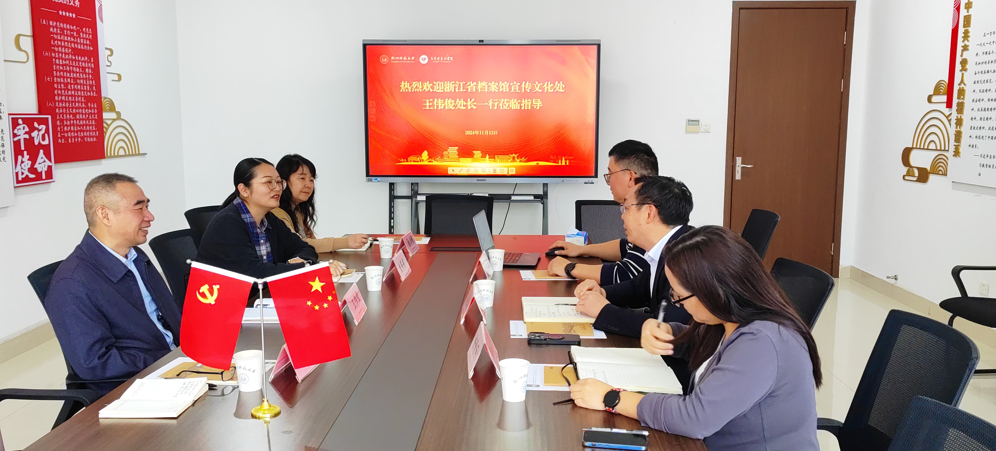 11月13日,浙江省档案馆宣传文化处处长、一级调研员王伟俊带领处室团队一行4人到亚洲无码 调研“浙里望道”思政品牌建设及洽谈思政大课合作等领域的工作。马院党委书记、院长李洪波、副院长龚上华参与了交流。马院教务科科长梅慧英、办公室主任倪龙海与会座谈。