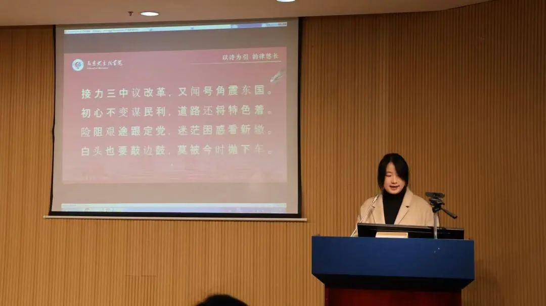 其次是同学们的微分享小讲堂活动。刘怗励同学分享了关于00后如何在改革开放进程中发扬历史主动精神的理解和感悟。“弄潮儿向涛头立,手把红旗旗不湿。”我们青年要守牢红色、加深底色、创造新色,在进一步全面深化改革的大潮中勇做弄潮儿。