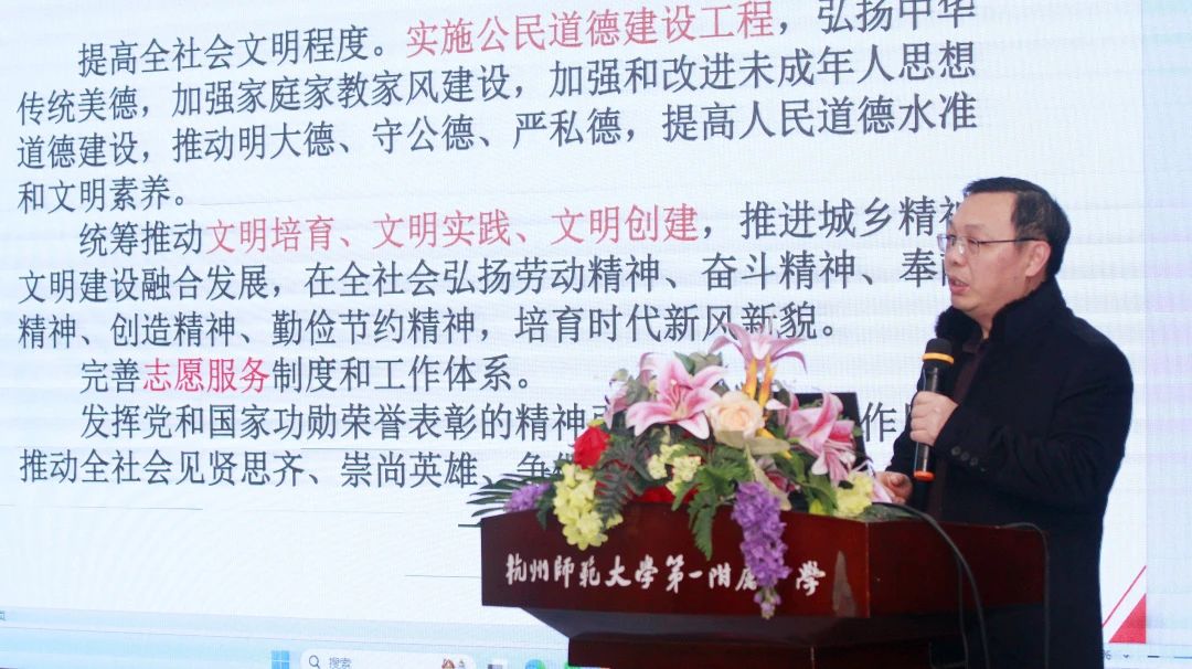 习近平总书记指出:“要在全社会广泛弘扬奉献、友爱、互助、进步的志愿精神。”12月25日,李洪波院长一行11人参加了在杭师附小举行的第五届吴山思政教育学术节。杭师大马院作为此次思政教育学术节的协办单位,是在致力于贯彻学校党委推进大中小思政教育一体化建设、探寻破解家校政社协同育人的有力举措,也是推进马院基地建设的重要抓手。