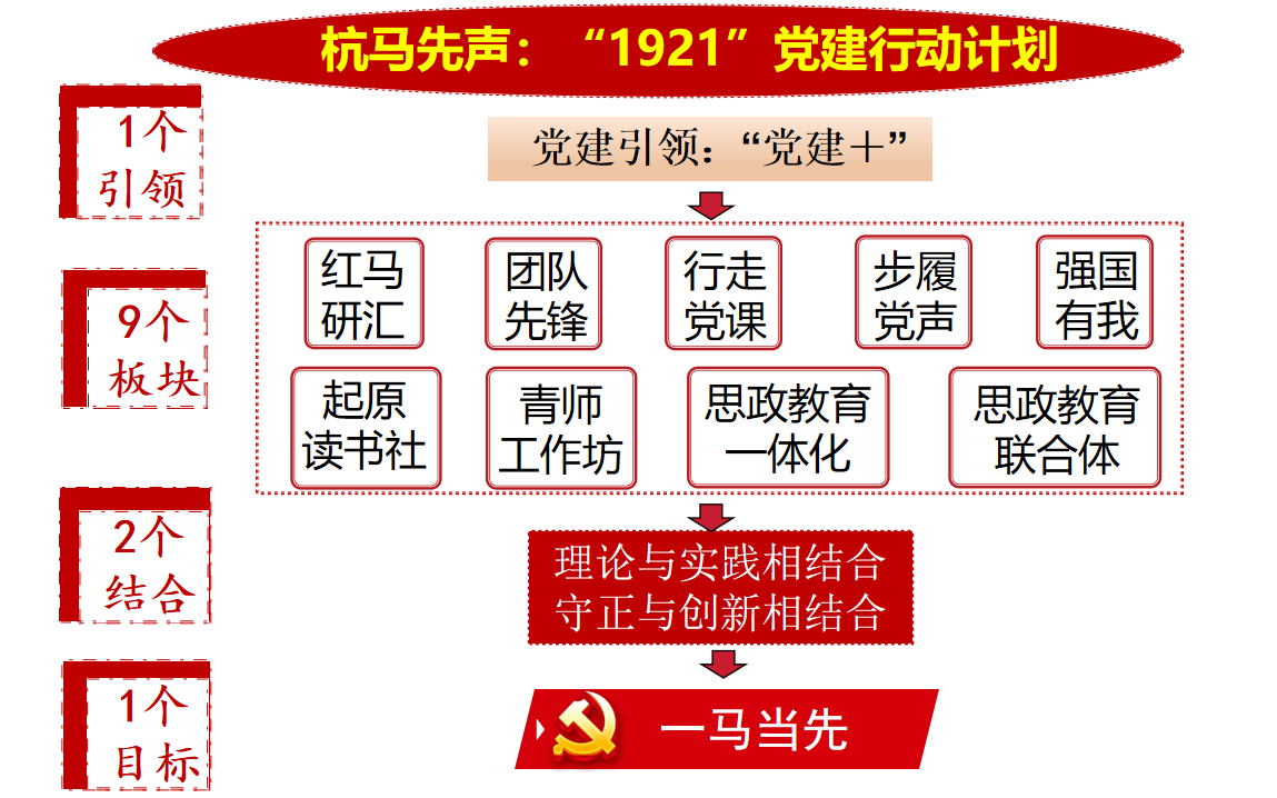着力打造“杭马先声”党建品牌,有力实施“1921”党建行动计划。“1个引领”即坚持党建引领,创新“党建+”模式。紧密结合专业特色与优势,深度探索党建与业务的有机融合。“9个板块”即扎实开展“红马研汇”、“团队先锋”、“行走党课”、“步履党声”、“强国有我”、“起原读书社”、“青师工作坊”、“思政教育一体化”、“思政教育联合体”等板块活动。“2个结合”即坚持理论与实践相结合,坚持守正与创新相结合。注重将党建工作融入学院事业发展全过程各方面,把党建优势转化为学院事业发展的强劲动力。“1个目标”即坚持“一马当先”的目标导向,牢记“为党育人、为国育才”的初心使命,做到“马院先行”,充分发挥马院示范引领、带动辐射作用。
